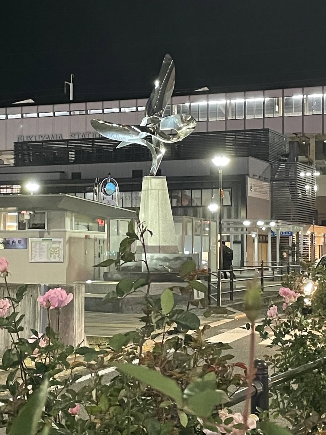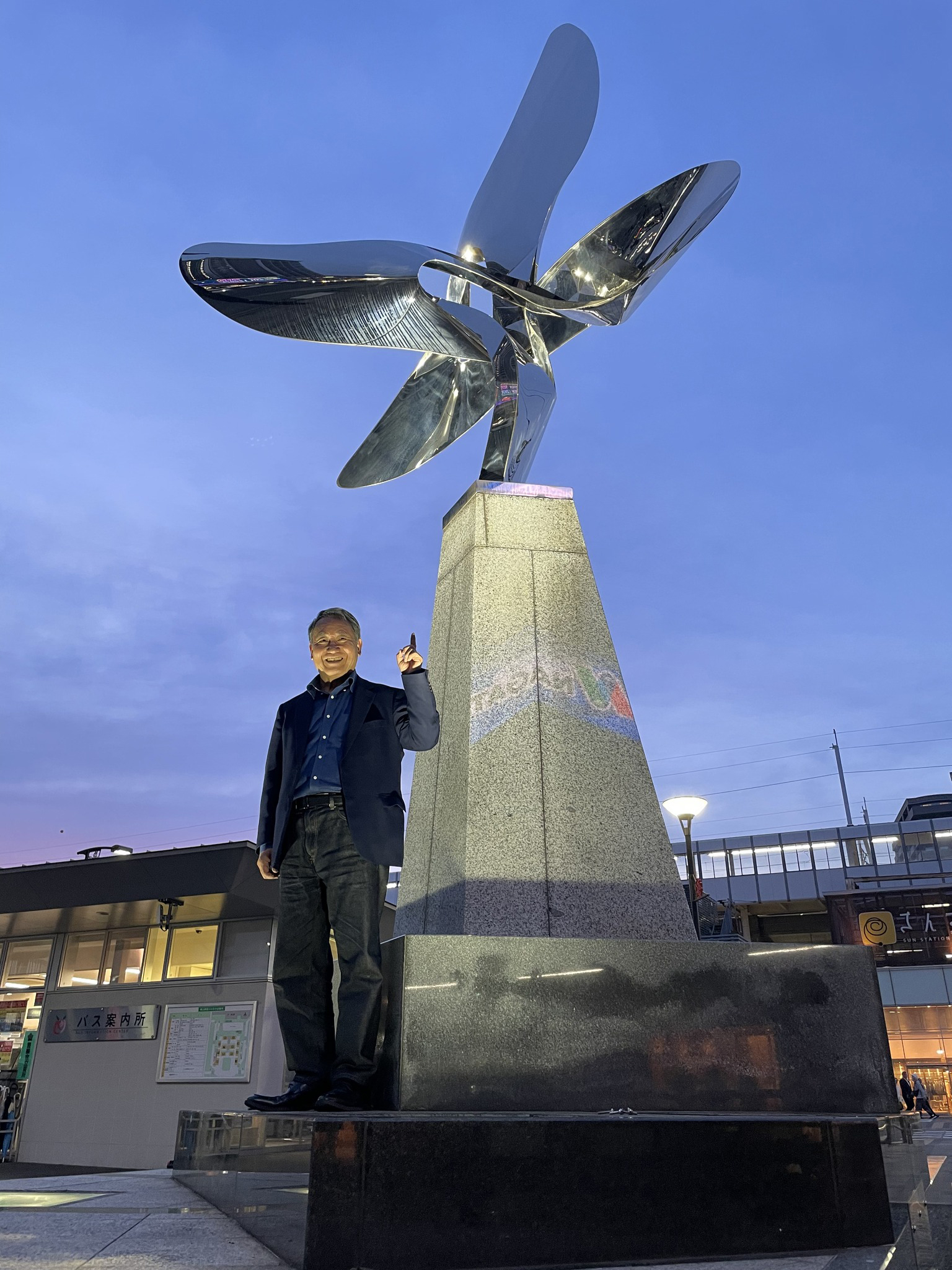 There are very few places in Japan where the Shinkansen “Nozomi” train stops at two stations within the same prefecture. Along with Hiroshima, Fukuyama is one of them. The “Now is the Future” monument in front of Fukuyama Station’s south plaza was installed in 2012 to commemorate the 95th anniversary of Fukuyama City’s municipal incorporation. Although it hadn’t received much maintenance since then, the restoration of the lighting and cleaning have made it shine brilliantly at night. Every time I return to my hometown of Fukuyama, I check on the maintenance status of the monument.